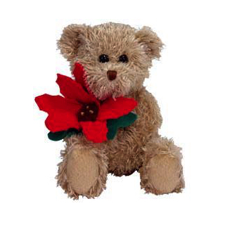 The 2005 Holiday Teddy is a brown bear made from fuzzy fabric. He has a traditional style teddy face with black button eyes and a brown stitched nose. He holds a large red and green poinsettia in his arms.