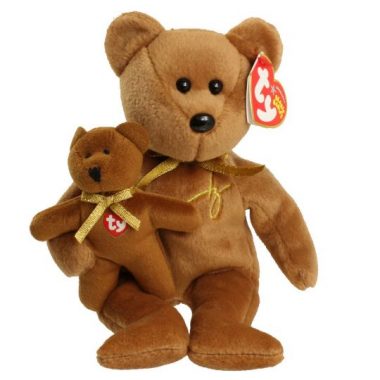 The 2005 Signature bear is made from brown material and features black button eyes and a black button nose. Tied around it’s neck is a gold ribbon and on it’s chest is a golden embroidered signature and the number “2005”. The bear is holding a miniature brown bear a wearing a gold ribbon in it’s right paw. On the smaller bear’s chest is a small red heart with “Ty” written inside in white lettering.