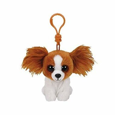 Barks is a Papillon type dog with a brown head and white muzzle and a white body. He has brown and black button eyes and a black button nose with an embroidered mouth. He has large, fluffy brown ears and a white fluffy tuft on his belly. His tail is fluffy and brown.