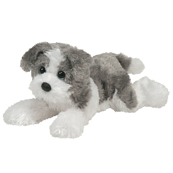 Fetch is a fuzzy grey dog with a white face, belly and legs. He has silver and black button eyes and a black button nose.