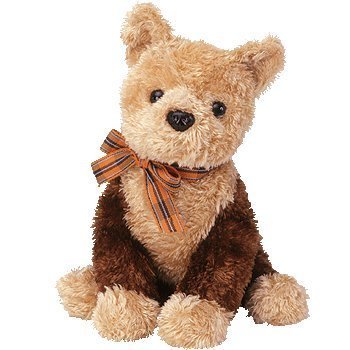 Fidget is a fuzzy light brown terrier-type dog with a dark brown back and dark brown legs. He has black button eyes and a black nose. He has a red tartan ribbon tied around his neck.