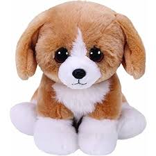 Franklin is a light brown dog with a white muzzle, belly and feet. He has large brown and black button eyes and a black nose with black stitching for his mouth.
