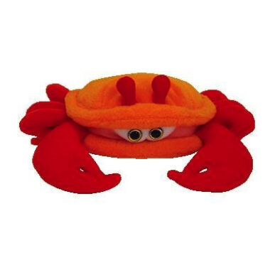 Grumbles is a bright orange crab with gold and black button eyes on white material. He has red antennae, large red claws and six red legs.