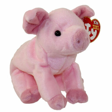 Hamlet is a pink pig with black button eyes and a slightly darker pink nose with pink stitching for his nostrils. His trotters and inner ears are darker pink.