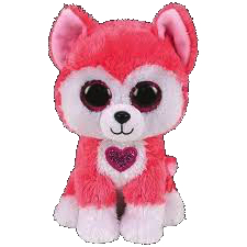 Aphrodite is a bright pink husky with large, glittery pink button eyes and a black button nose with black stitching for her mouth. Her face, belly and paws are white and her inner ears are light pink.