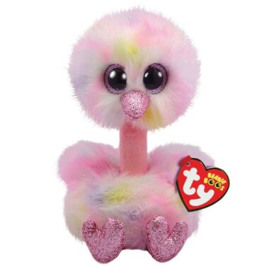 Avery is a pastel pink, purple and yellow ostrich with large, glittery pink button eyes and a sparkly pink beak. Her long neck is pink and she has tiny wings and sparkly pink legs and feet.