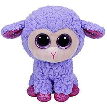 Lavender is a lilac coloured sheep with wool effect fur. She has large, glittery purple button eyes on a peach coloured face and a pink embroidered mouth. The inside of her ears and her hooves are shiny pink.