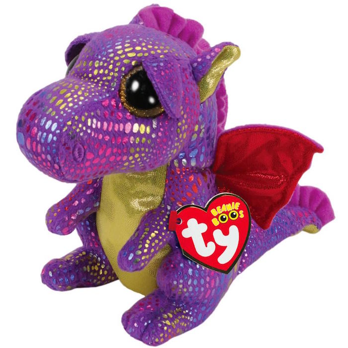 Spectra is a purple dragon covered in a shiny scale pattern. She has large, glittery gold button eyes with droopy eyelids and embroidered purple nostrils. Her belly and inner ears are shiny gold and she has a purple ridge running along her spine. Spectra has two bright red, shiny wings.