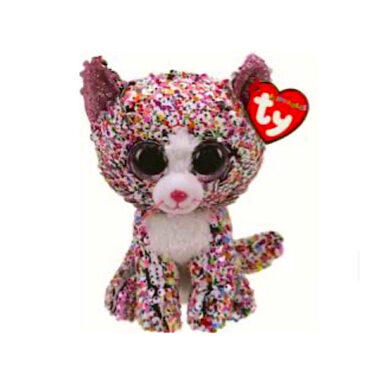 Confetti is a cat covered in multicoloured reversible sequins all over her body. She has large, glittery pink button eyes and a bright pink nose with a pink thread mouth and whiskers. She has a fuzzy white belly and muzzle and her inner ears are sparkly pink.