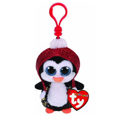 Gale is a penguin with reversible sequins that change from black to gold when you run your hands over them. He has large, glittery blue button eyes and a sparkly orange beak and feet. His face and belly are fuzzy and white. He wears a sparkly red winter hat with a white pom pom on top and two white pom poms hanging either side of his head.