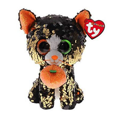 Jinx is a cat covered in reversible sequins that change from black to gold when you run your hands over them. Her left eye is glittery green and her right is glittery orange. She has an orange button nose and a white muzzle with orange stitching for her mouth. Her belly is fuzzy and white and her inner ears are sparkly orange. She carries a sparkly orange pumpkin from her mouth with a green stalk.