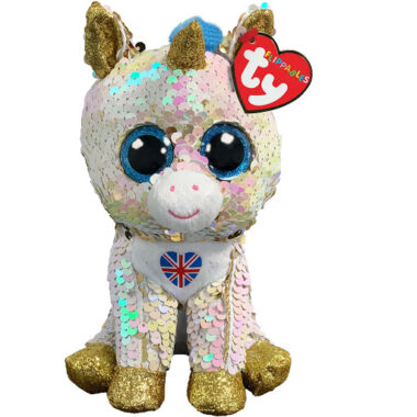 Royal is a unicorn covered in reversible sequins that change from white to gold when you run your hands over them. She has large, glittery blue button eyes and a white muzzle with pink stitching for her mouth and nostrils. Her hooves, inner ears and horn are sparkly gold and her mane and tail are fluffy and blue. She has a white belly with an embroidered Union Flag on it.