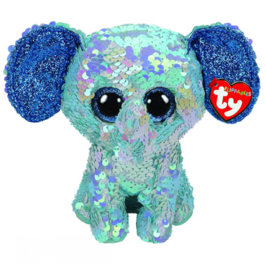 Stuart is an elephant covered in reversible sequins that change from light blue to silver when you run your hands over them. He has large, glittery blue button eyes and a long trunk. The inside of his large ears are sparkly blue.