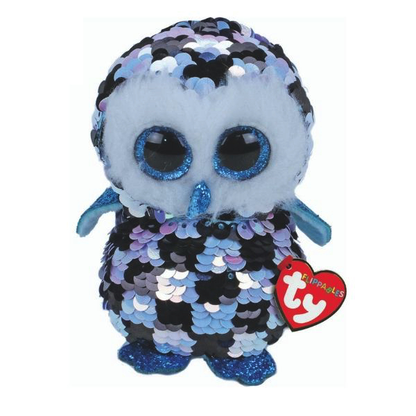 Topper is an owl covered in reversible sequins in a blue and black check pattern. He has large, glittery blue button eyes and a sparkly blue beak on a fluffy white face. His wings and feet are sparkly blue.