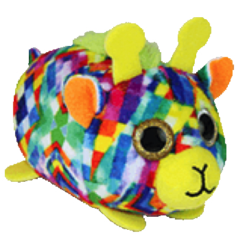 Mabs is a tiny giraffe covered in a multi-coloured patchwork pattern. She has gold glittery button eyes and a yellow muzzle with a black embroidered mouth and nose. Her tiny feet are bright yellow. Mabs has two tiny yellow horns on her head and a fuzzy green mane.