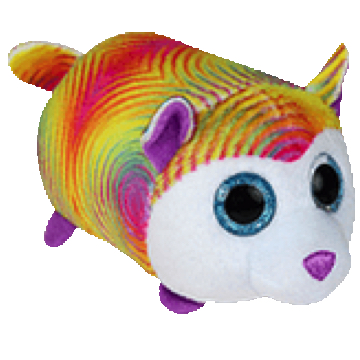 Prince is a tiny husky covered in a psychedelic swirly pattern. He has blue glittery button eyes on a white face and a purple nose. Prince’s feet are bright purple.