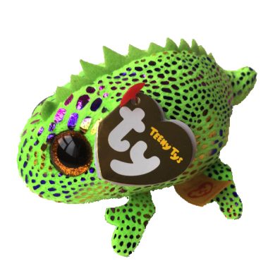 Chaser XV is a bright green lizard covered in shiny, multi-coloured scales. He has glittery orange button eyes and green spikes running along his spine.