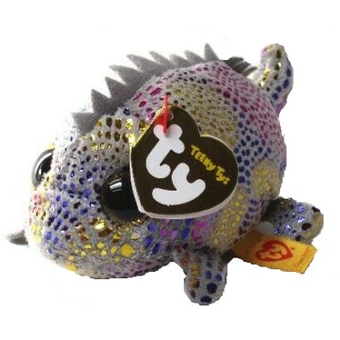 Chaser XVII is a white lizard covered in shiny, multi-coloured scales. She has glittery gold button eyes and grey spikes running along her spine. She has the Finnish flag on her belly.