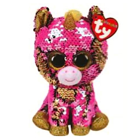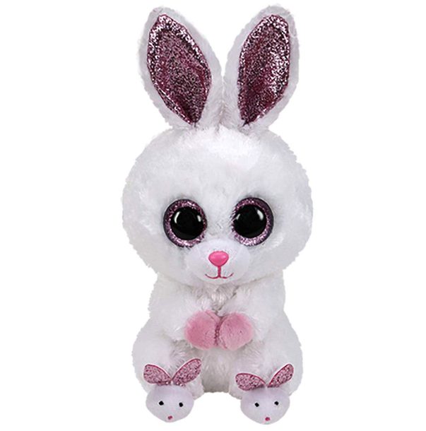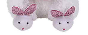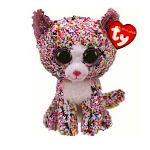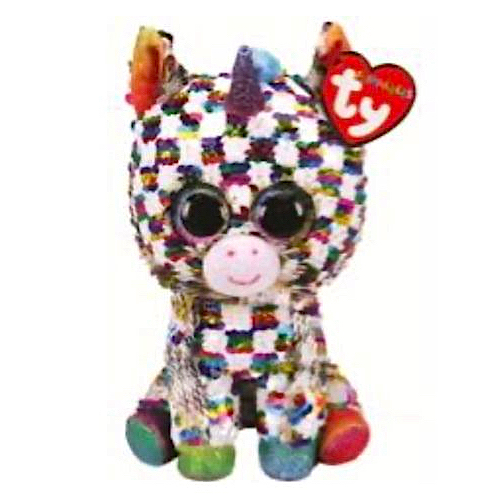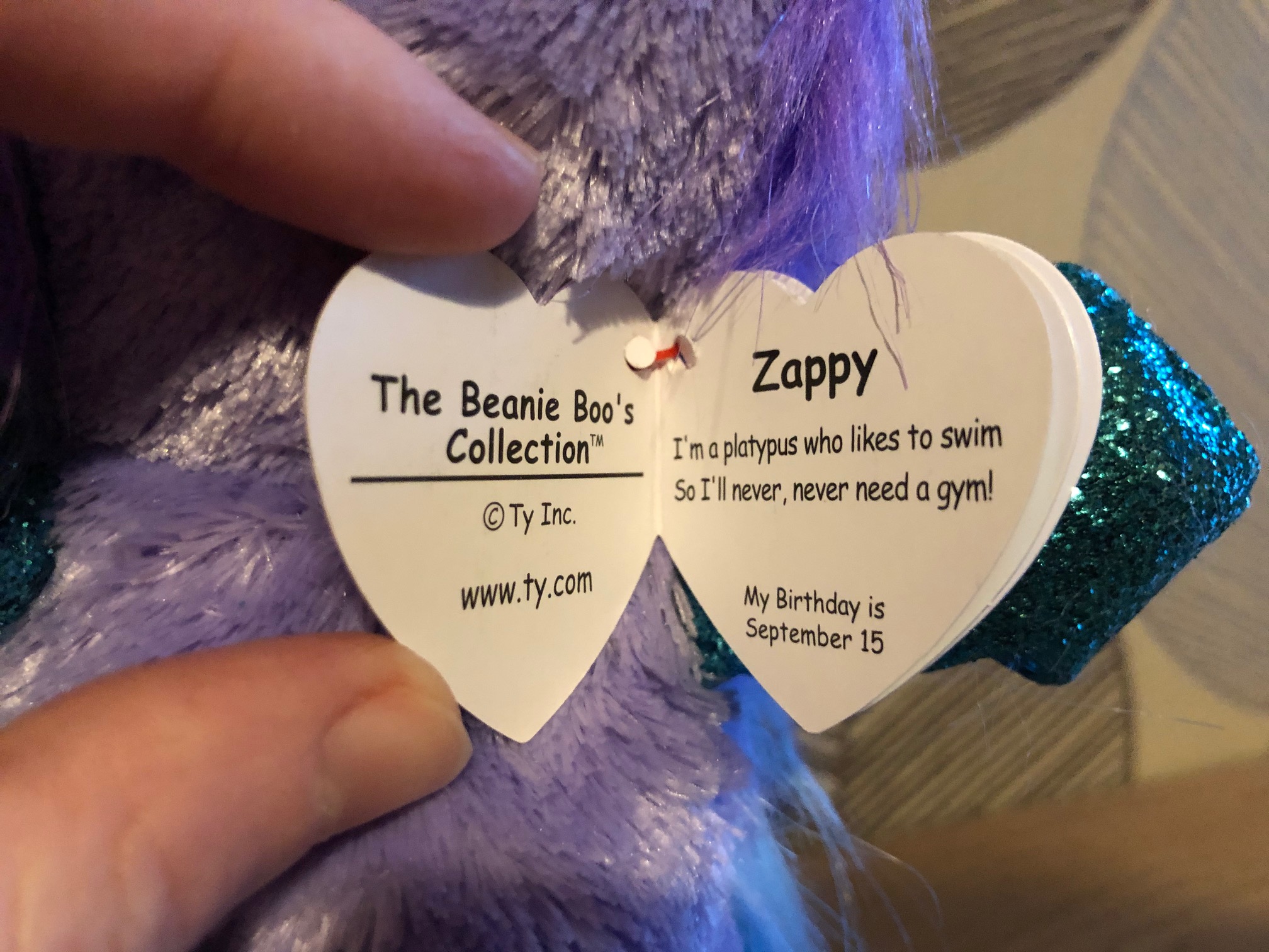 Zappy was released in 2019 in both the small and medium sizes of Beanie Boo. He is a purple, pink, blue and white platypus with a fluffy body except for his lavender coloured belly, which is made from the smoother Ty Silk material. His eyes (shown below) are glittery purple and slightly smaller than that of most Beanie Boos. His flippers and bill are made from sparkly turquoise fabric, covered in glitter.